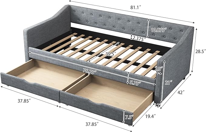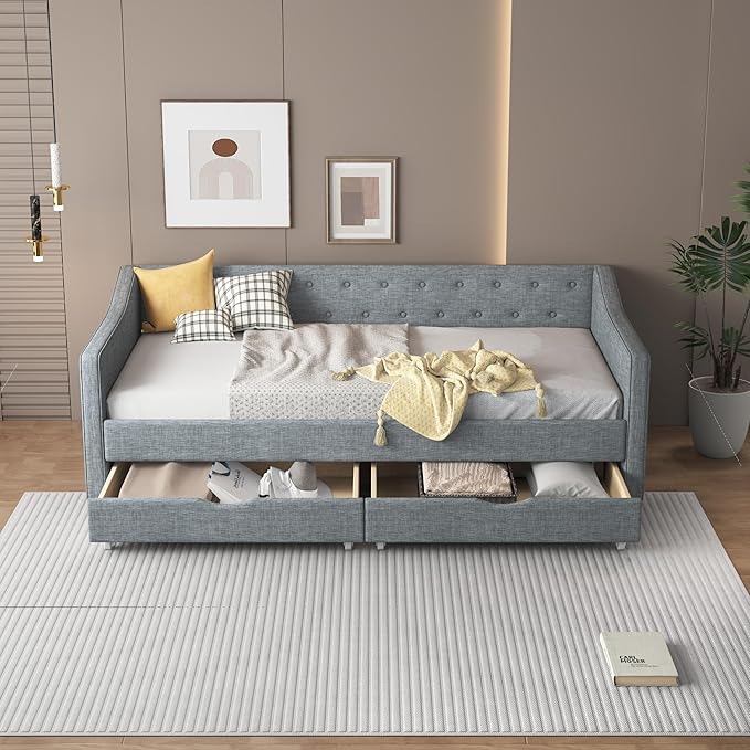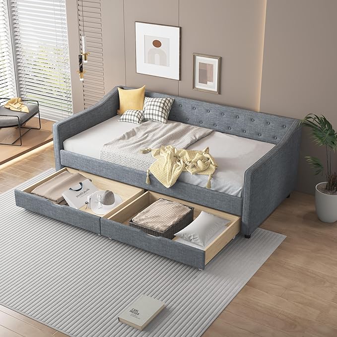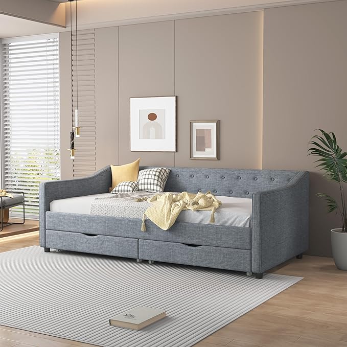 Twin Daybed Frame with 2 Storage Drawers,Upholstered Sofa Bed W/Button & Nailhead Tufted Design,Wood Slats Support,Linen Fabric Bedframe for Living Room Bedroom Apartment,Light Gray