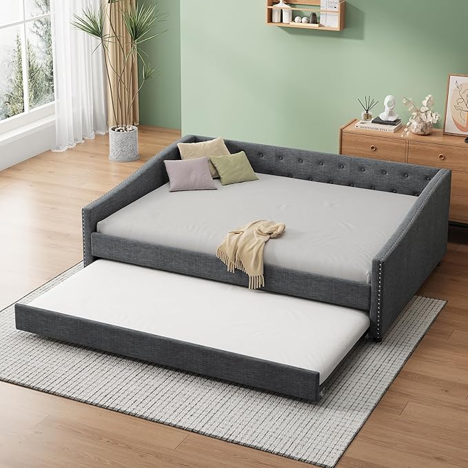 Full Daybed Frame with Trundle,Upholstered Sofa Bed W/Button & Nailhead Tufted Design,Wood Slats Support,Saving Space,Linen Fabric Bedframe for Living Room Bedroom Apartment,Dark Gray