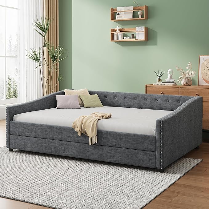 About This Linen Fabric 【Elegant Upholstered Daybed】This mid-century inspired daybed features a button-tufted back that creates an elegant aesthetic. The...