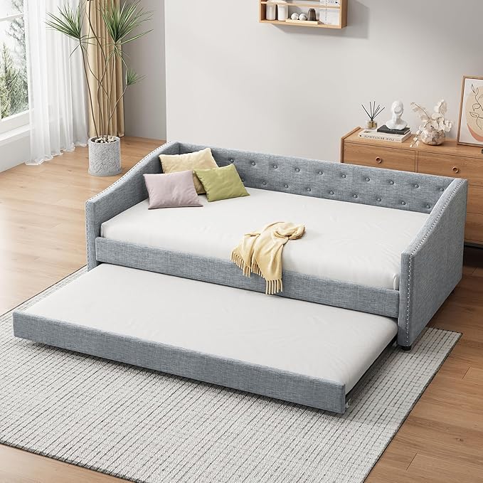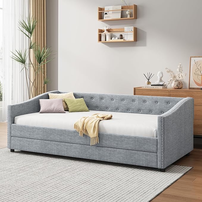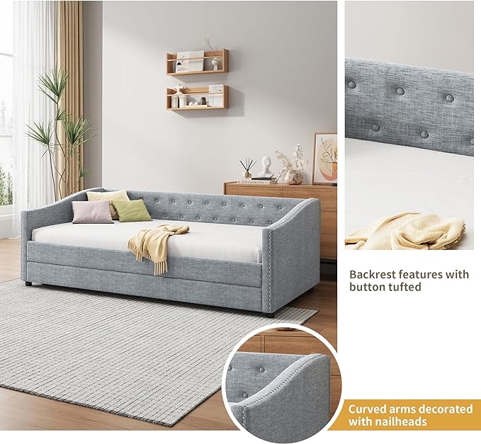 Twin Daybed Frame with Trundle,Upholstered Sofa Bed W/Button & Nailhead Tufted Design,Wood Slats Support,Saving Space,Linen Fabric Bedframe for Living Room Bedroom Apartment,Light Gray