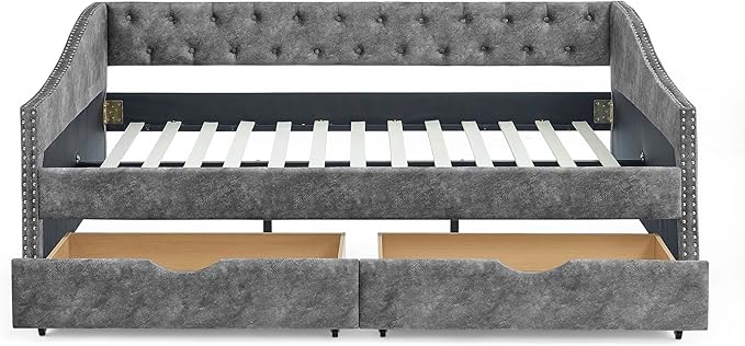 Full Size Daybed with 2 Storage Drawers,Linen Upholstered Sofa Bed W/Button on Back & Copper Nail on Waved Shape Armrests,No Spring Box Need,Wood Bedframe for Living Room Bedroom Dorm,Grey