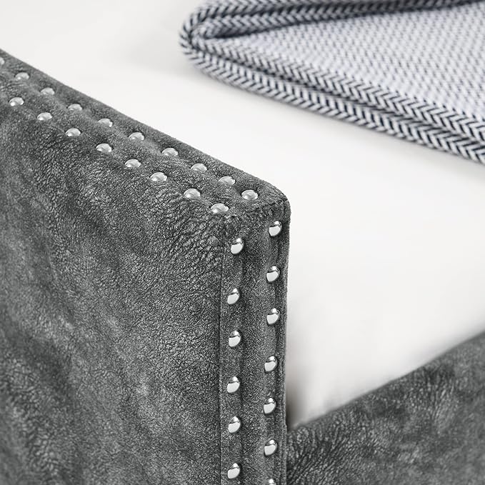 Full Size Daybed with Trundle,Linen Upholstered Sofa Bed W/Button on Back & Copper Nail on Waved Shape Armrests,Space Saving,No Spring Box Need,Wood Bedframe for Living Room Bedroom Dorm,Grey