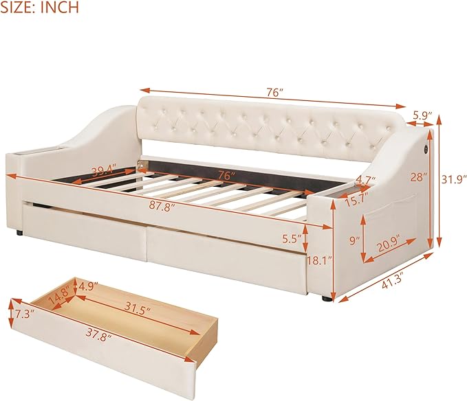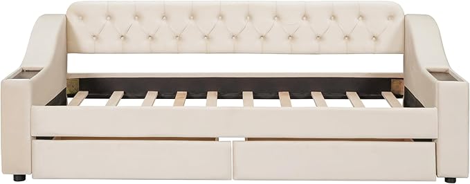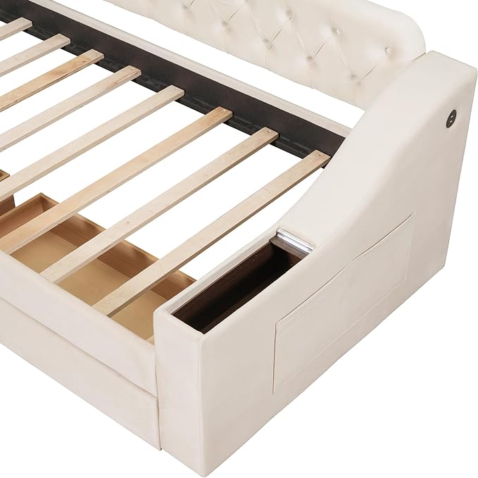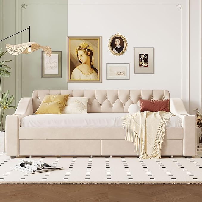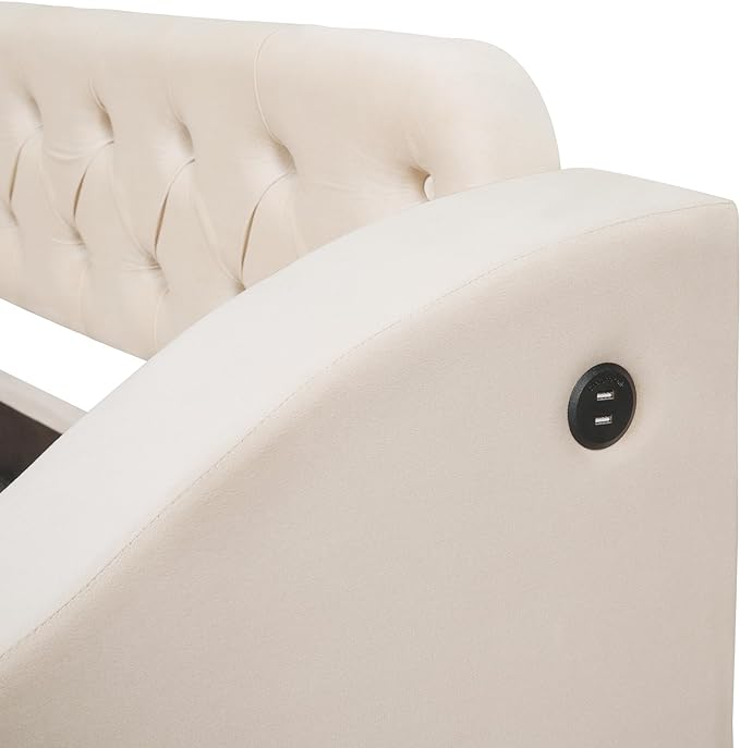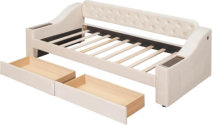 Twin Size Daybed with Storage Armrests & 2 Drawers,Upholstered Sofa Bed W/USB Ports & Button Tufted Backrest,No Box Spring Needed,Multi-Function Bedframe for Living Room Bedroom,Beige Velvet