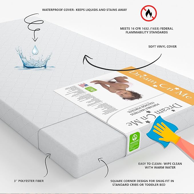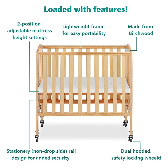 About This Easy to assemble folding portable crib with stationary rail system and dual locking wheels for safety Fiber core...