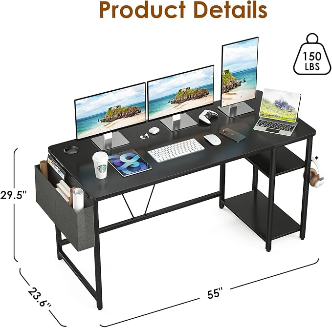 Computer Desk, 55” Home Office Desks, Modern Small Desk for Bedroom, Gaming Desk with Iron Hook and Height Adjustable Feet, Sturdy Student Writing Desk with Storage Bag, Storage Shelves