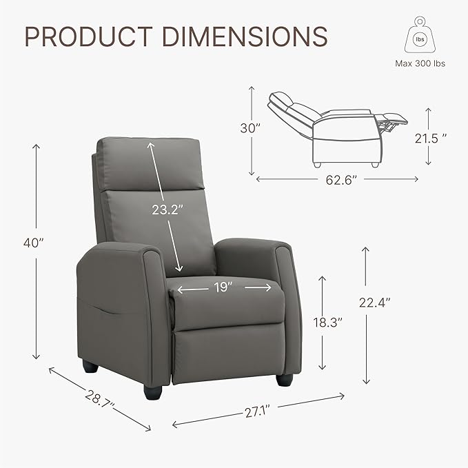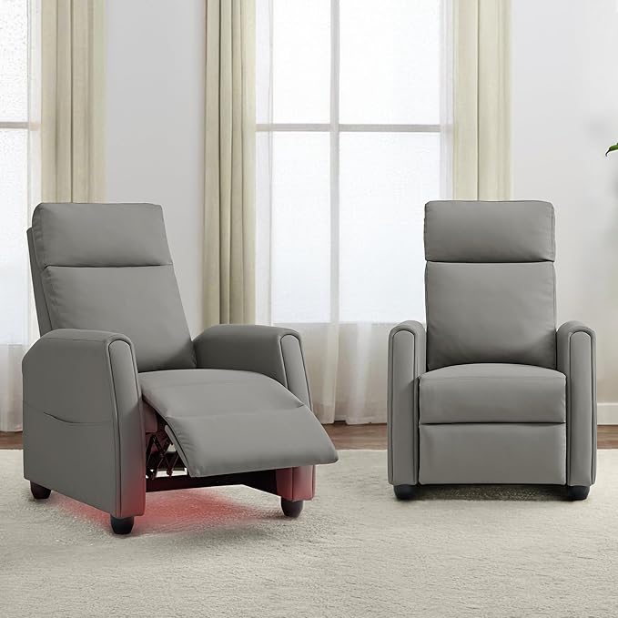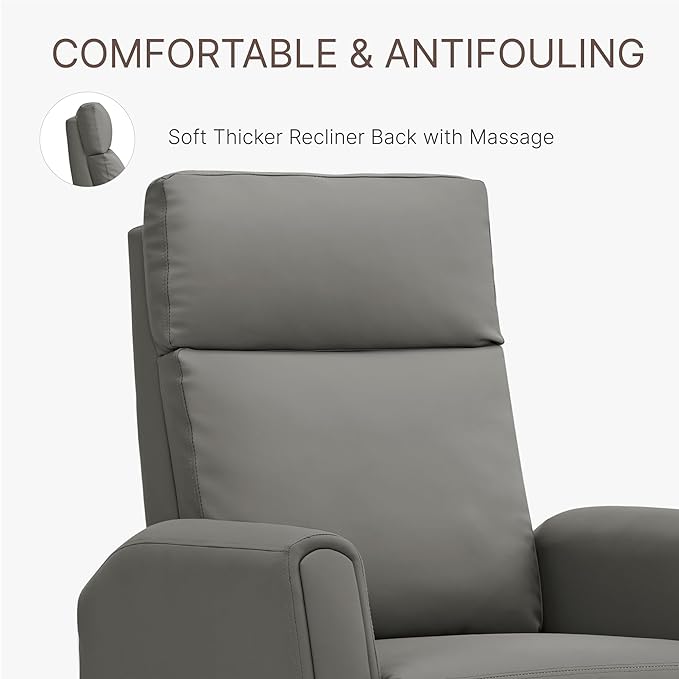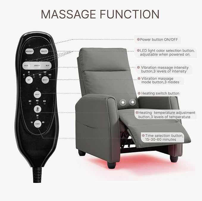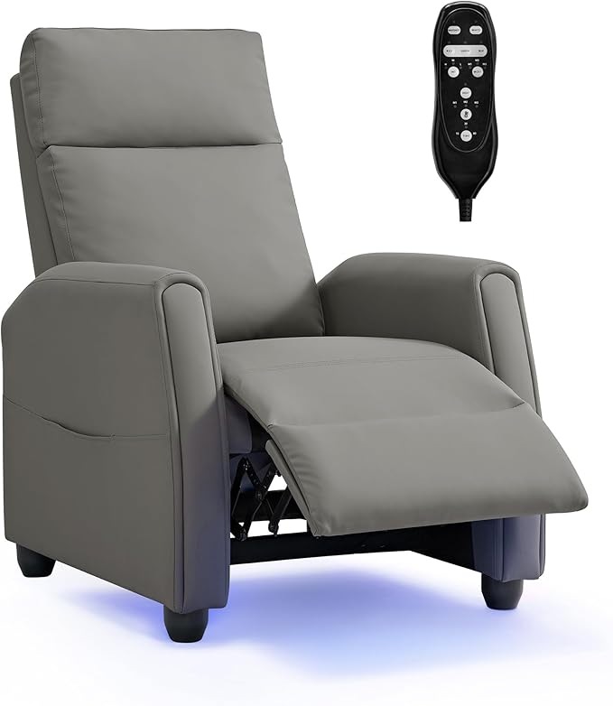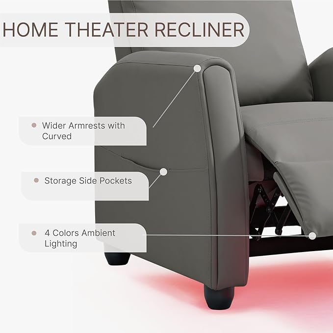 Recliner Chair for Adults PU Leather Push Back Armchair with 4 Colors Ambient Lighting Home Theater Seating with Massage & Heat Vibration Single Sofa for Living Room, Gray