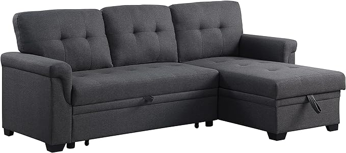 L-Shape Sectional Sleeper Couches with Chaise Storage and Pull, 84 inch 3 Seater Sofa Bed w/Tufted Linen Backrest for Living Spaces Apartment Dorm, Gray, 84inch, Dark Grey-4