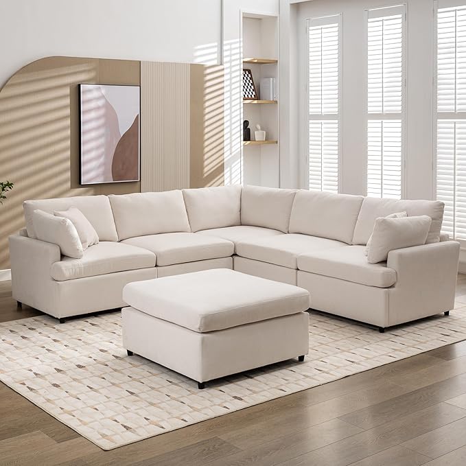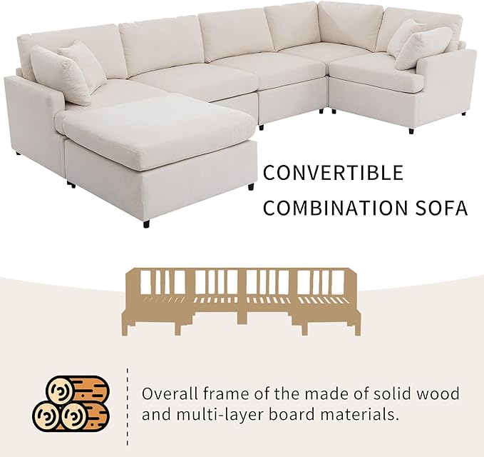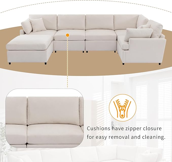Modern 3 Seater Sofa with Removable Back and Seat Cushions, Linen Upholstered Sectional Couch w/ 4 Pillows & Sturdy Wood Legs for Living Room, Apartment, Office, 91 Inch, 152.8inch, Beige-5