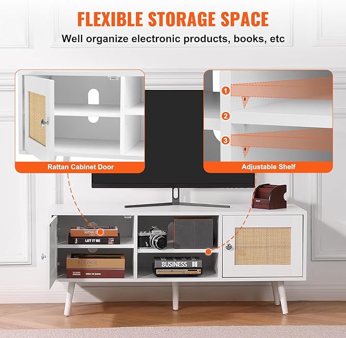 VEVOR Rattan TV Stand, Boho TV Cabinet for 55 inch TV, Mid Century Modern TV Stand, Rattan TV Console with Adjustable Shelfs for Living Room, Media Room, White