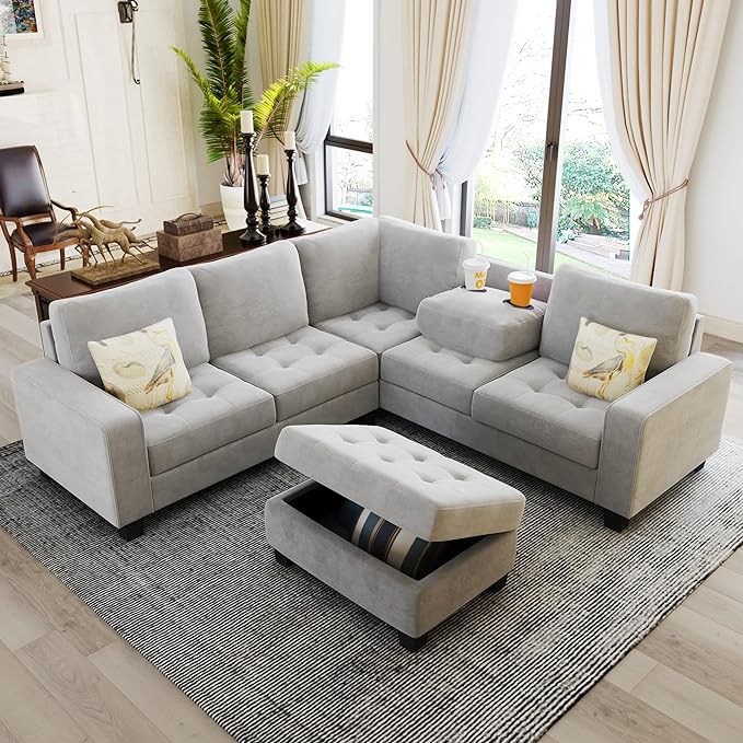 Sectional Sofa Couch w/Ottoman & Chaise, Upholstered L Shape Modular Sofa&Couch,Button Tufted Comfy for Living Room Furniture Sets, Home, LIGHT GREY CupHolders