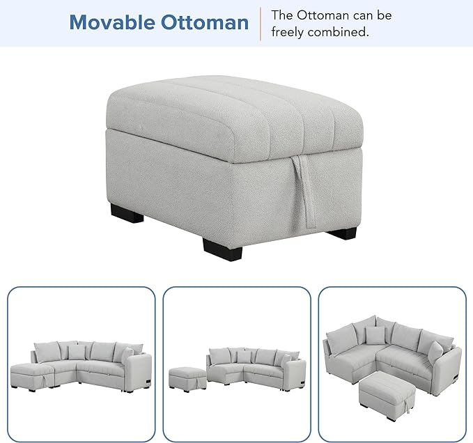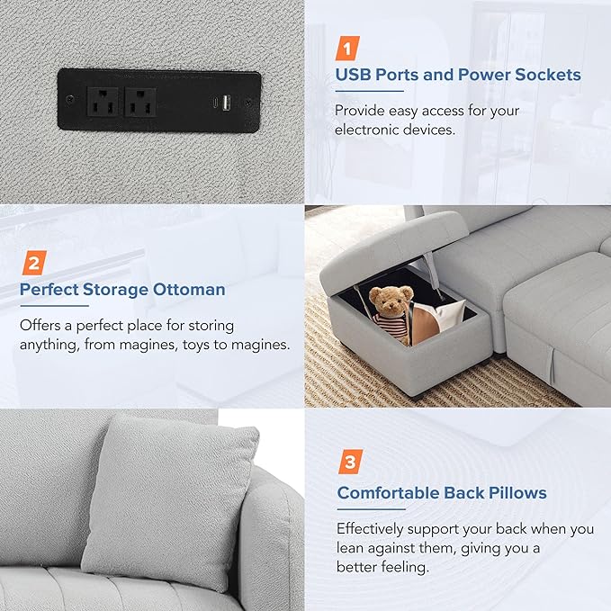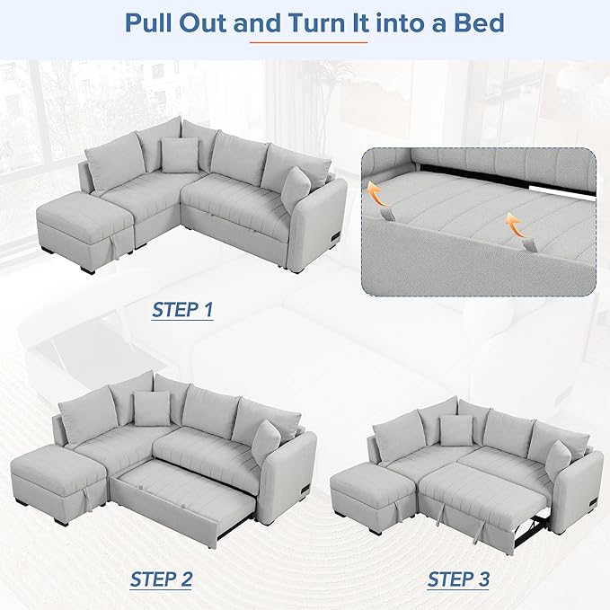 82" L-shaped Sectional Sleeper Sofa with Chaise,Pull Out Bed for Living Room Furniture Sets, 2 USB Ports, Power Sockets and Movable Storage Ottoman, Gray Upholstery