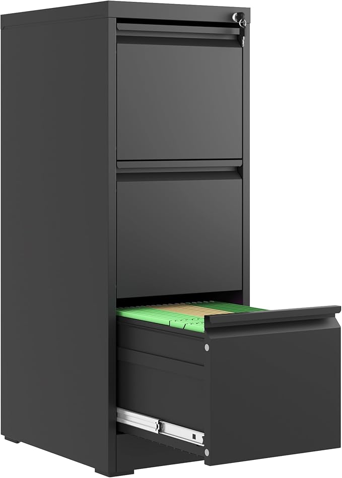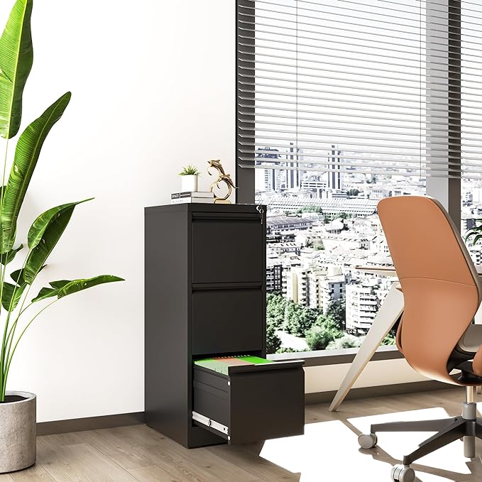 3 Drawer File Cabinet with Lock, Metal Vertical Filing Cabinets for Home Office, Steel Storage Cabinet for Hanging Legal/Letter Size Files, Assembly Required (Black)