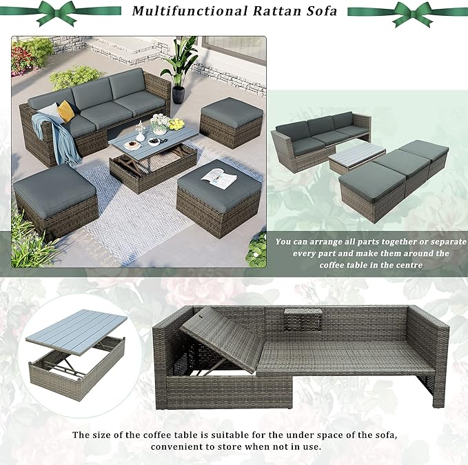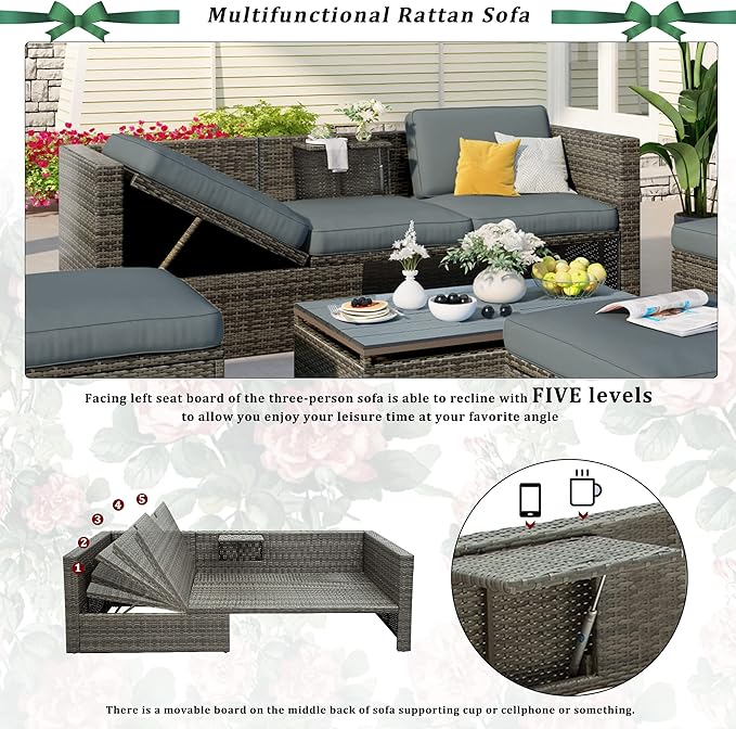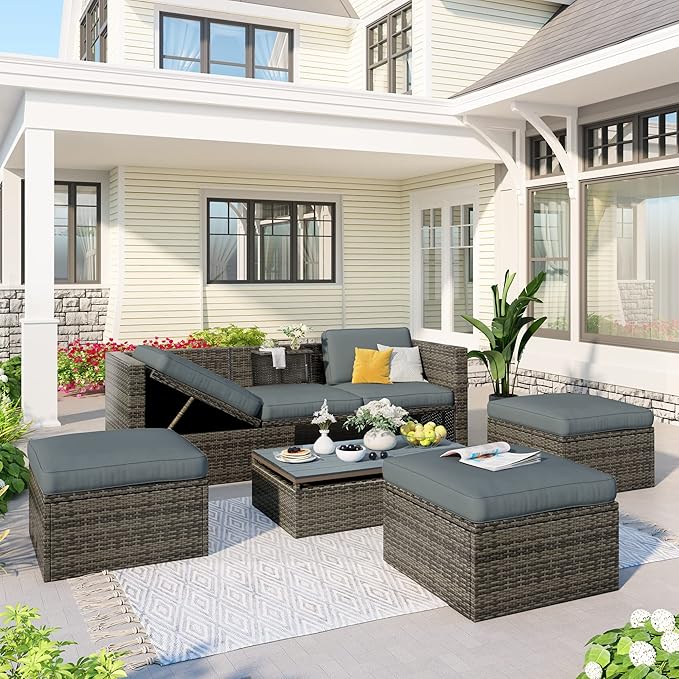 5 Pieces Patio Furniture Sets All Weather Wicker Rattan Sectional Sofa Outdoor Conversation with Adustable Backrest, Cushions, Ottomans and Lift Top Coffee Table for Poolside, Garden, Backyard
