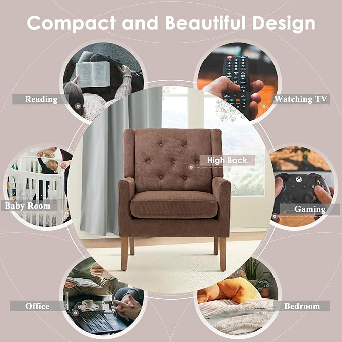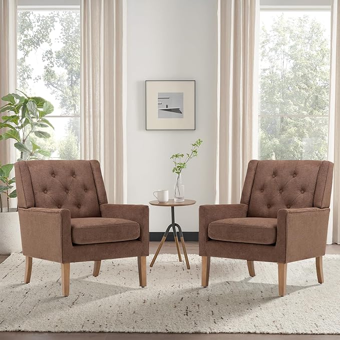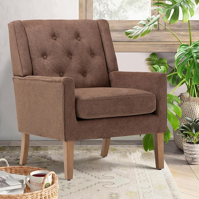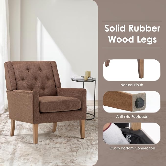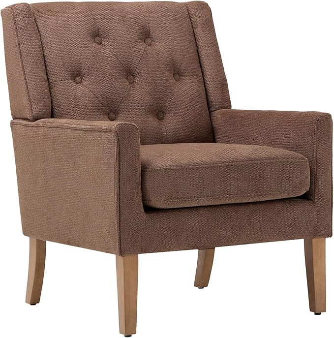 COLAMY Mid-Century Accent Chairs, Modern Wingback Living Room Chair, Upholstered Armchair with Button Tufted Back and Wood Legs for Bedroom/Office/Reading Spaces, Brown