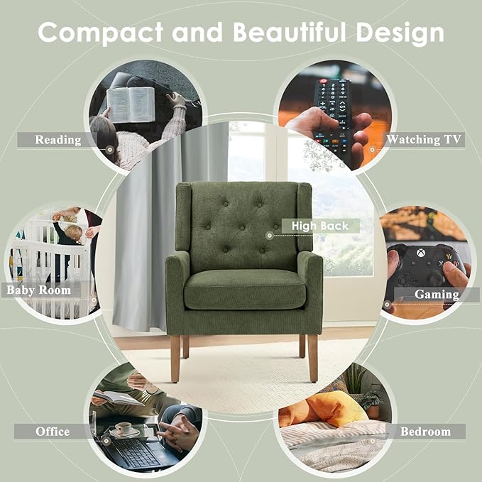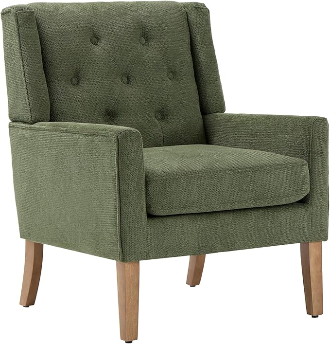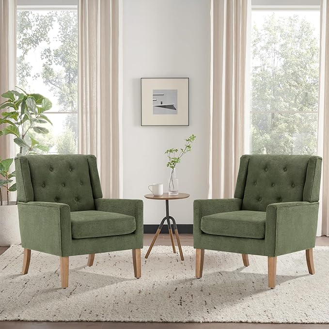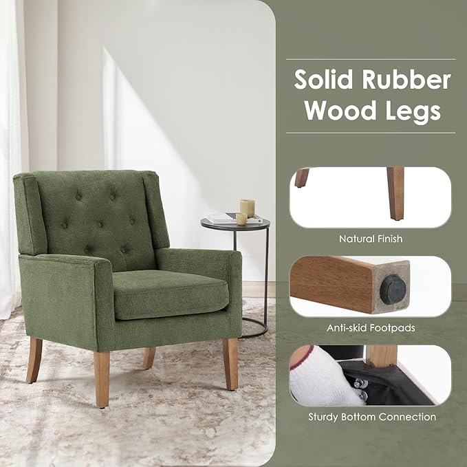 COLAMY Mid-Century Accent Chairs, Modern Wingback Living Room Chair, Upholstered Armchair with Button Tufted Back and Wood Legs for Bedroom/Office/Reading Spaces, Green