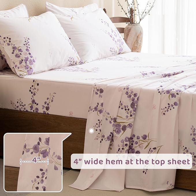QSH Purple Floral Bed Sheets King Size 100% Egyptian Cotton Lavender Flower Bedding Sheets King Size Bedsheets Sets 17.5" Extra Deep Pocket 4pcs