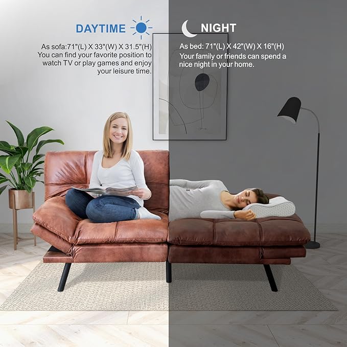 MUUEGM Faux Leather Futon Sofa Bed, Convertible Memory Foam Couch Bed, Modern Love Seat for Living Room,Compact Space,Apartment,Office,Adjustable Backrests Armrests Couch Sleeper,71" Brown