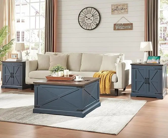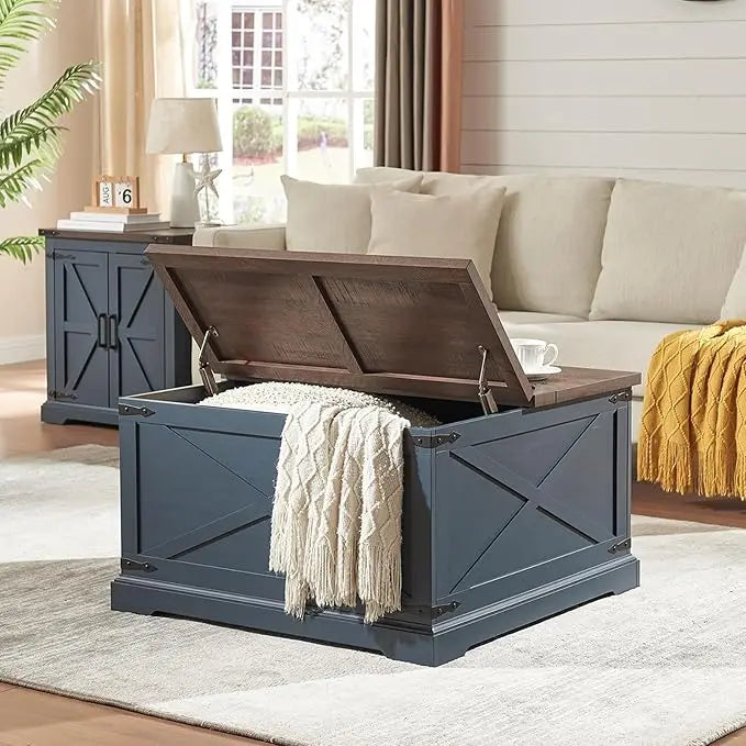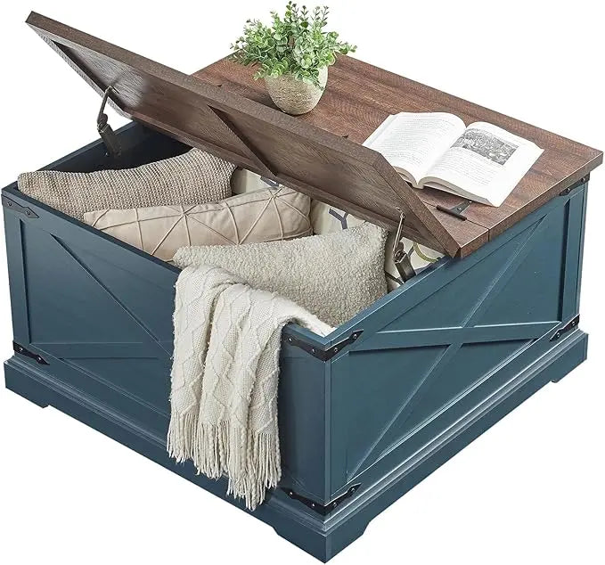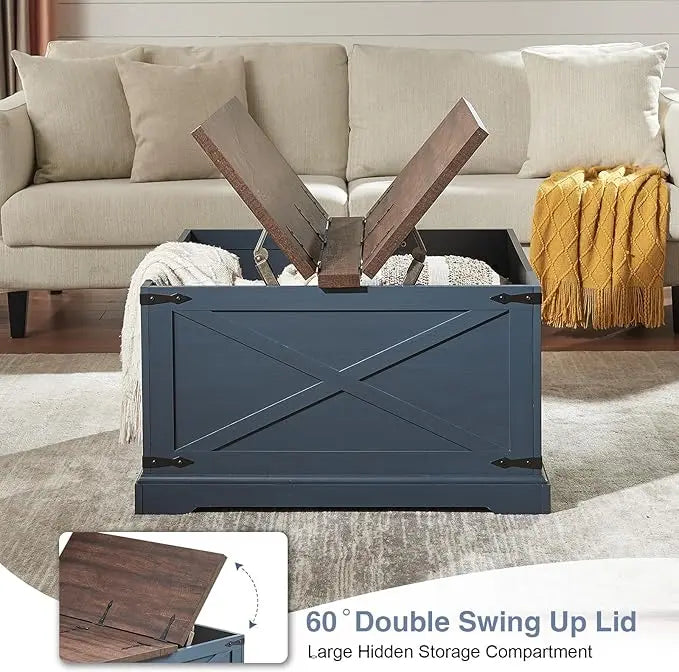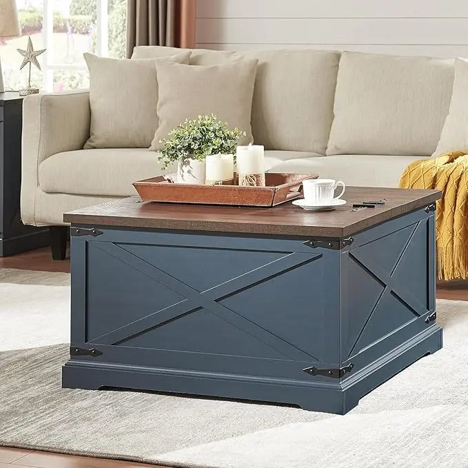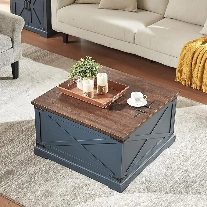 Farmhouse Square Coffee Table with Storage, Wood Center Table with Hinged Lift Top, Rustic Cocktail Table with Large Hidden Storage Compartment for Living Room, Bedroom,Blue
