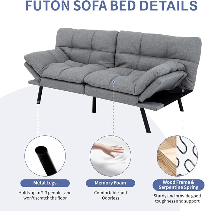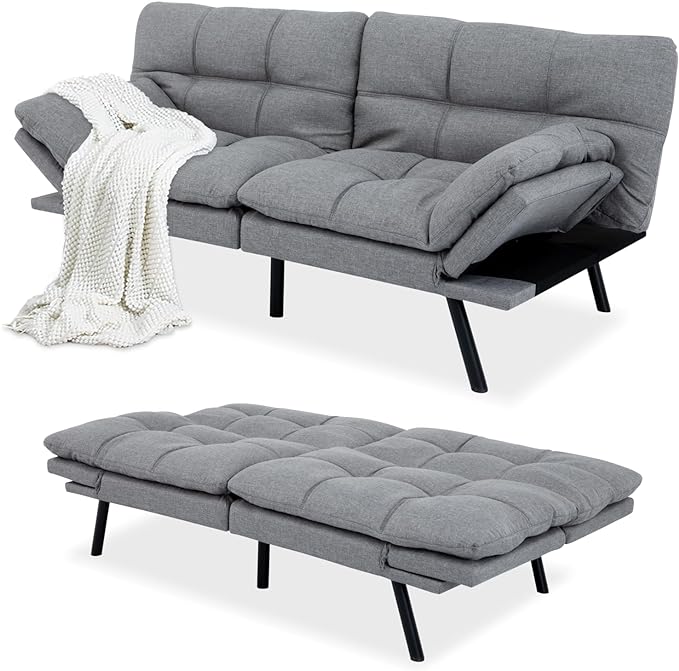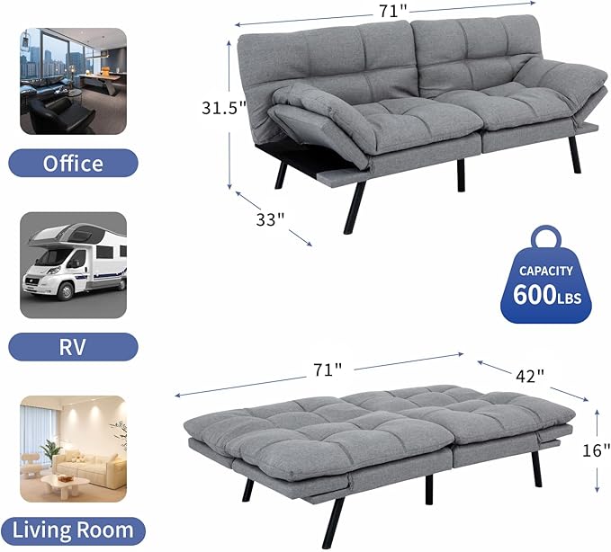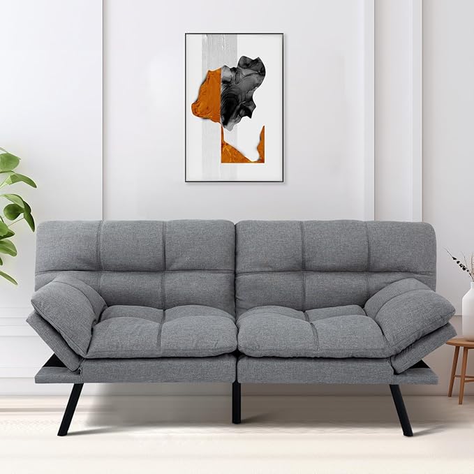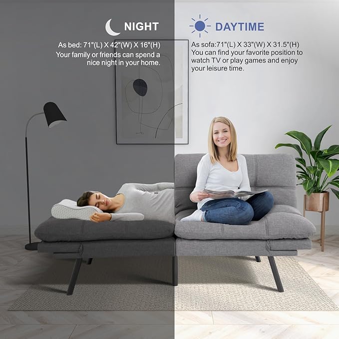 MUUEGM Futon Couch Bed, Convertible Memory Foam Sofa Bed, Modern Love Seat Daybed Sofa for Living Room,Small Space,Office,71",Adjustable Backrests Armrests Couch Bed Sleeper,Light Grey
