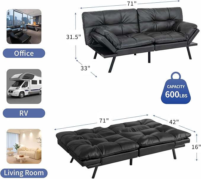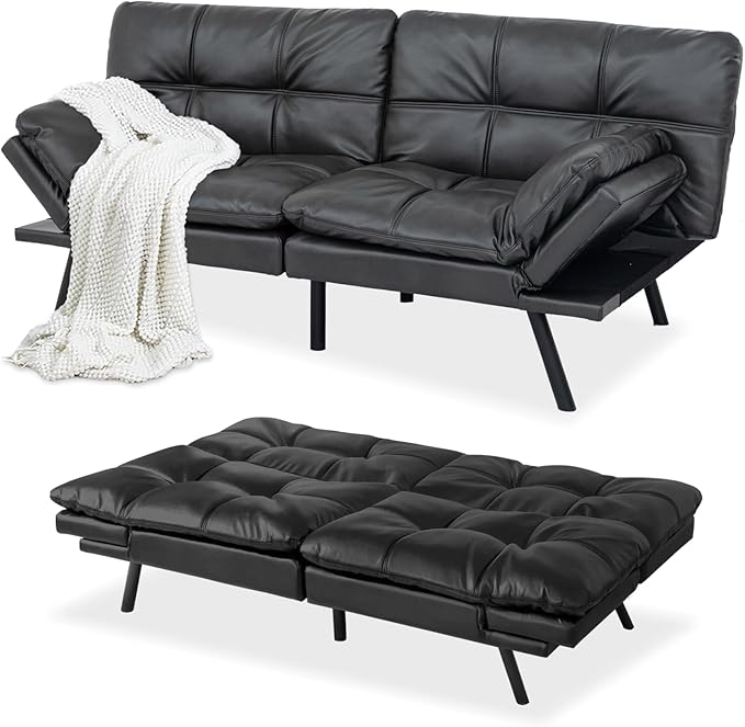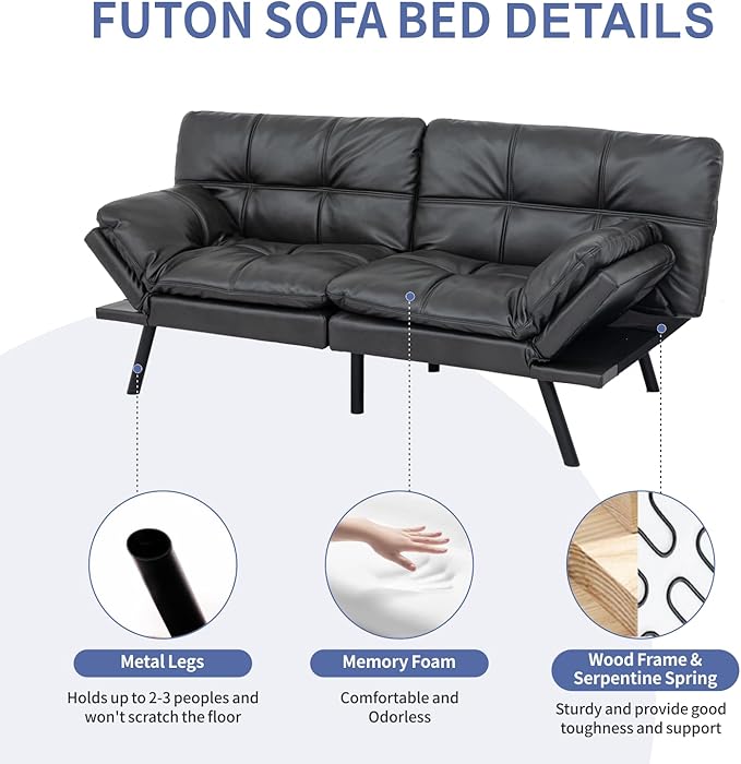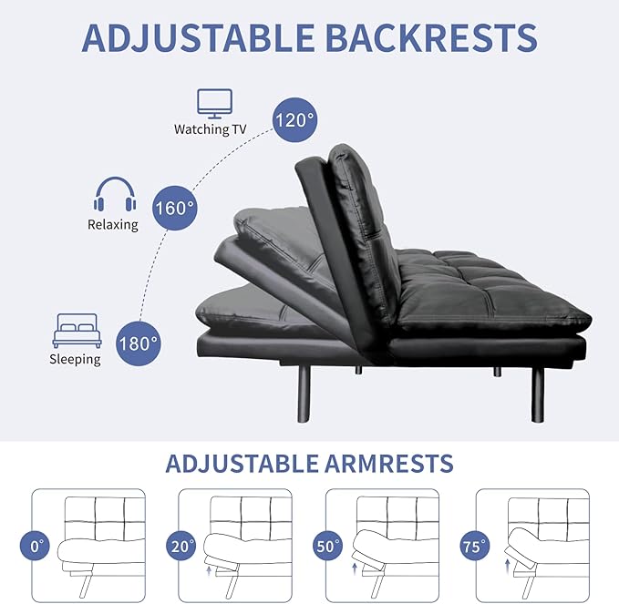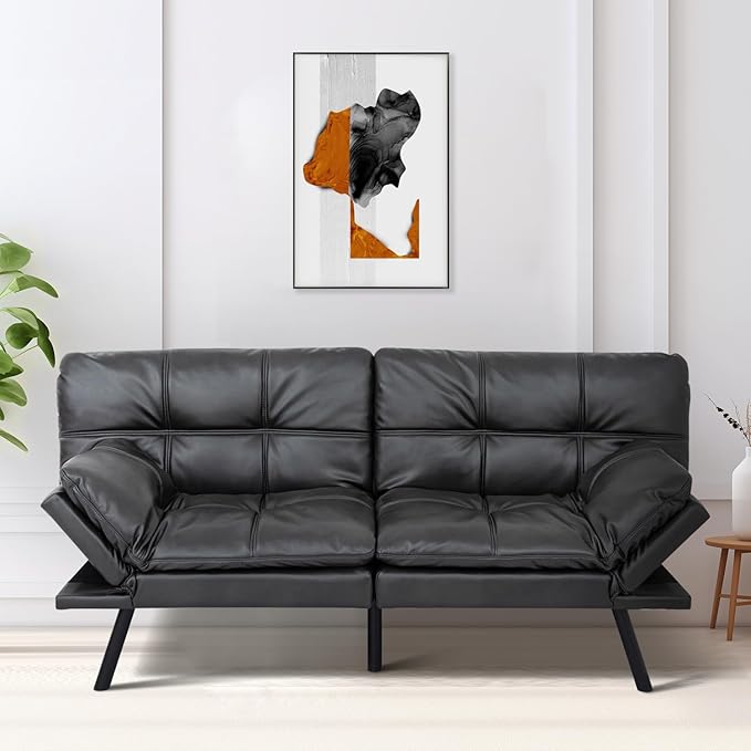 MUUEGM Futon Sofa Bed,Convertible Adjustable Backrest Armrests Memory Foam Couch Bed, Modern Faux Leather Futon Sleeper Couch Loveseat for Living Room,office,Apartment,Small Space,Matte Black