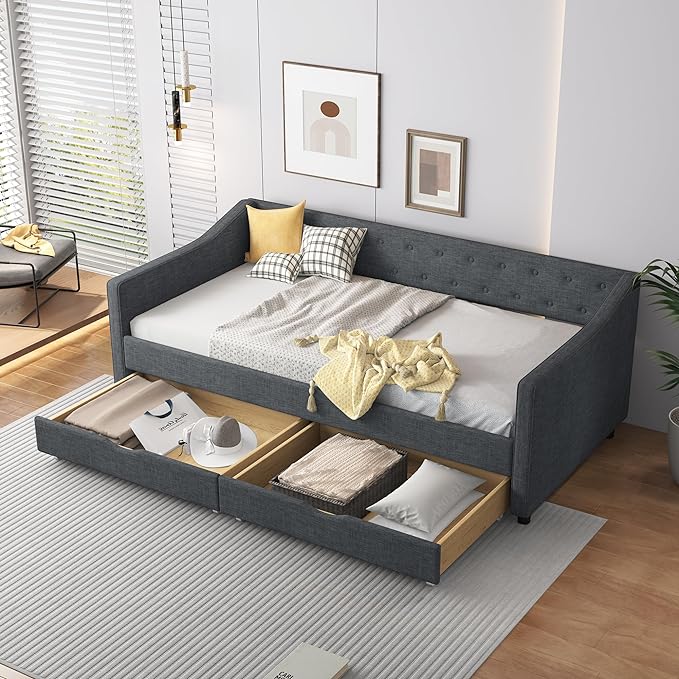 Twin Size Daybed with Storage Upholstered Day Bed frame with Drawers & Button Tufted Backrest,for Living Room Bedroom,Wood Slat Support,No Box Spring Needed,Dark Grey