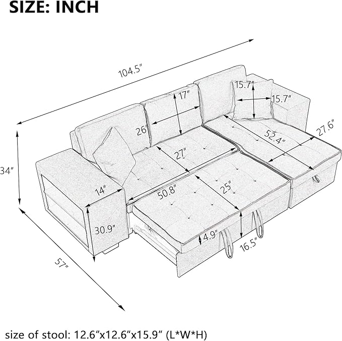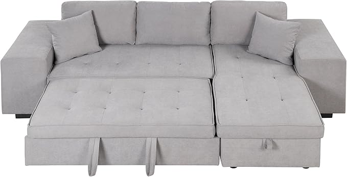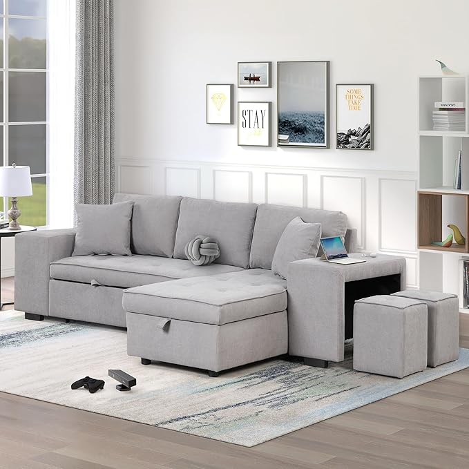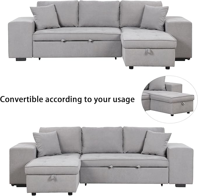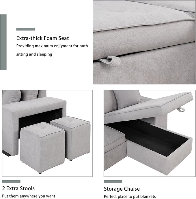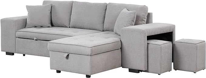 104" L Shape Reversible Sectional Sofa w/Pull Out Bed &Storage Chaise, Linen Upholstered Sleeper Couch with 2 Stools, for Living Room, Bedroom and Small Apartment, 104 Inch, Gray