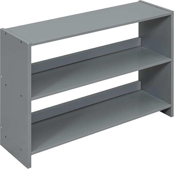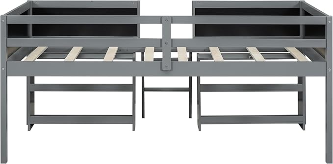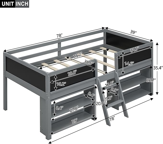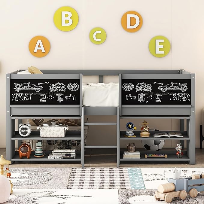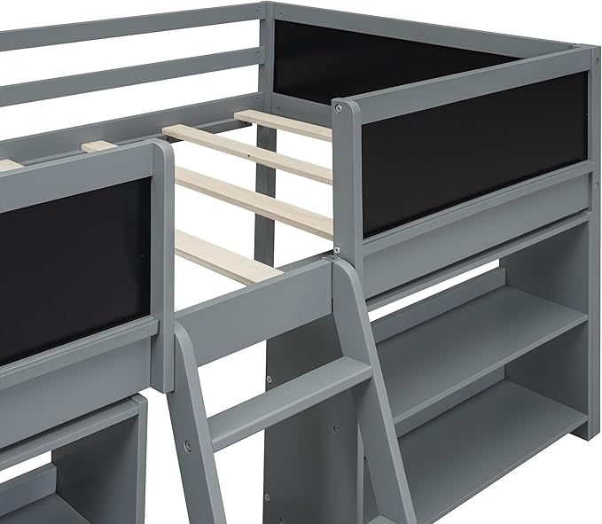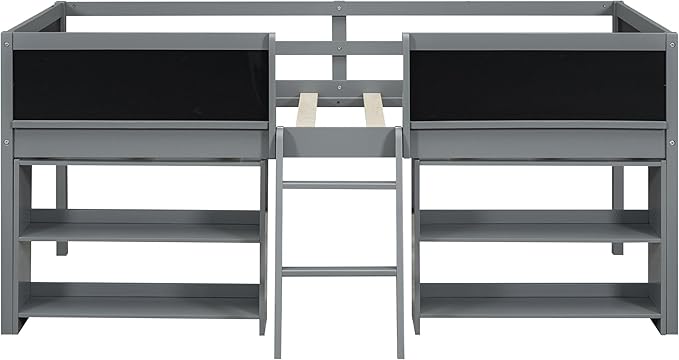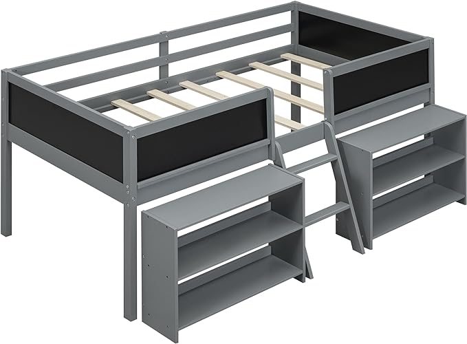 Twin Size Low loft Bed with Movable Shelves for Kids,Kids Low Loft Bed Frame with Guardrail Chalkboard and Storage,Solid Wood Loft Bed Twin for Boys,Girls(Gray)