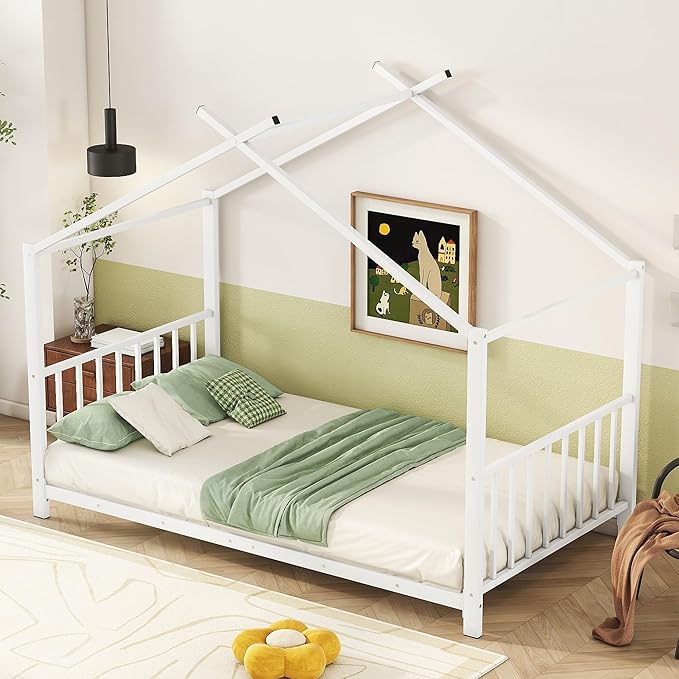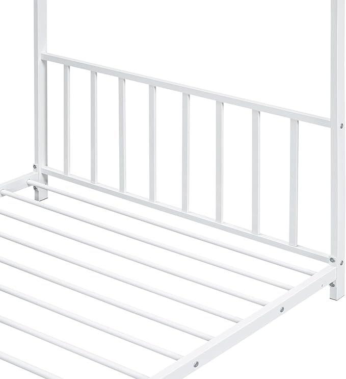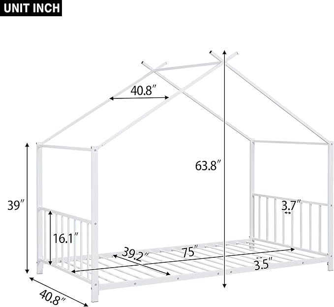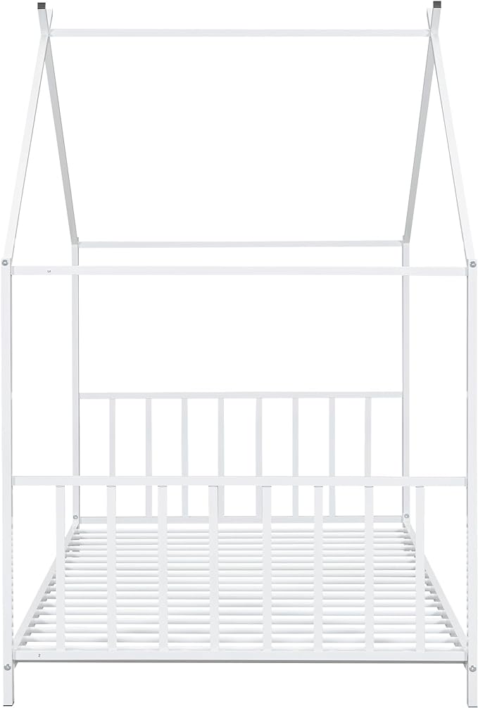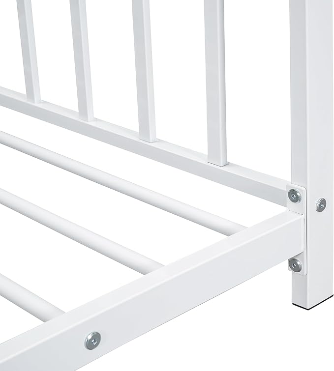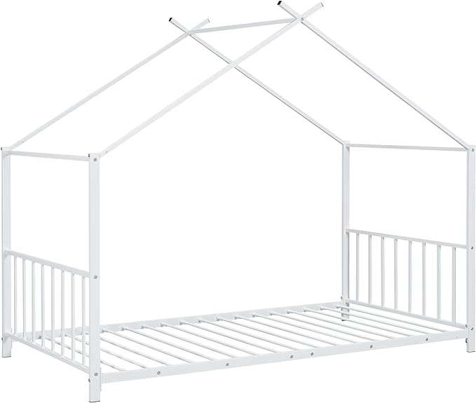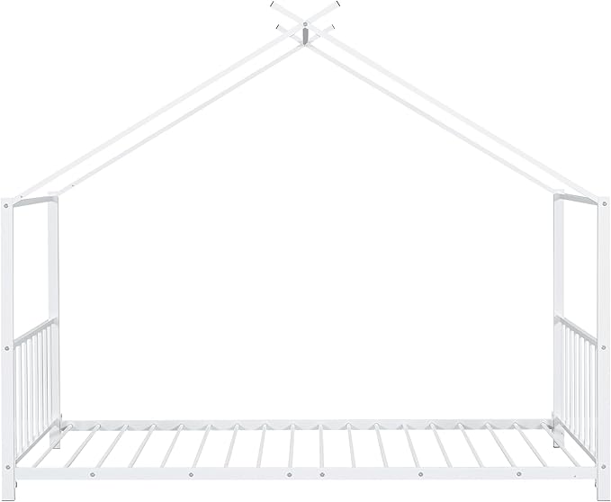 Twin Size Kids Montessori Floor Bed,House Bed Frame with High Headboard,Twin Floor Bed with Roof for Boys Girls,Floor Bed Metal Frame (White)