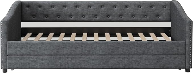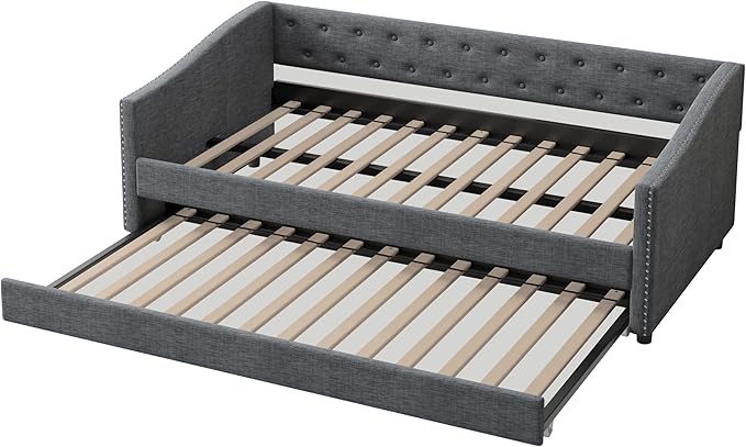 Twin Size Daybed with Trundle, Linen Upholstered Tufted Sofa Day Bed Frame with Button, Waved Shape Arms & Nailhead, Wooden Slats Support for Apartment,Bedroom