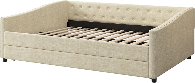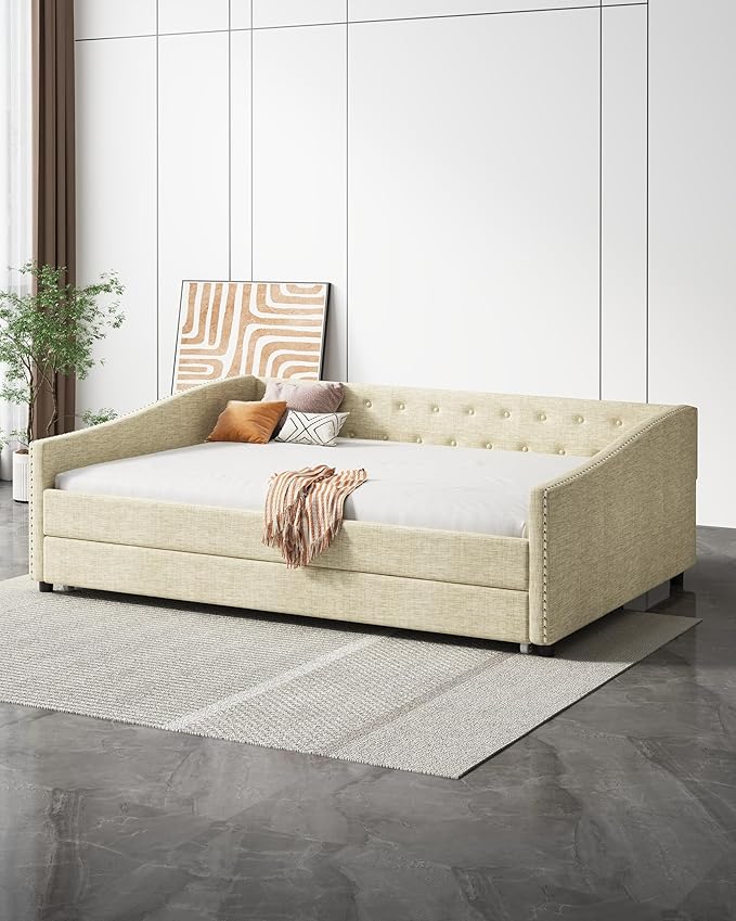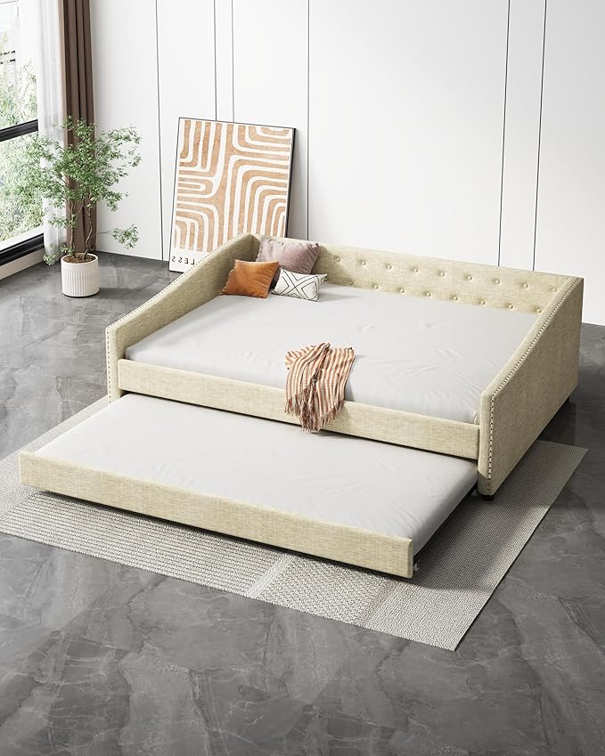 Full Size Daybed with Trundle, Linen Upholstered Tufted Sofa Day Bed Frame with Button, Waved Shape Arms & Nailhead, Wooden Slats Support for Apartment,Bedroom