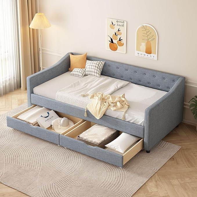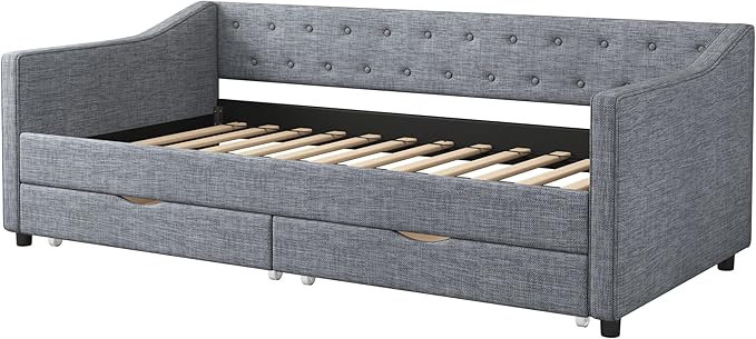 Twin Size Daybed with Drawers, Linen Upholstered Tufted Sofa Bedframe with Button on Back, Waved Shape Arms, Wooden Slats Support, for Apartment,Bedroom