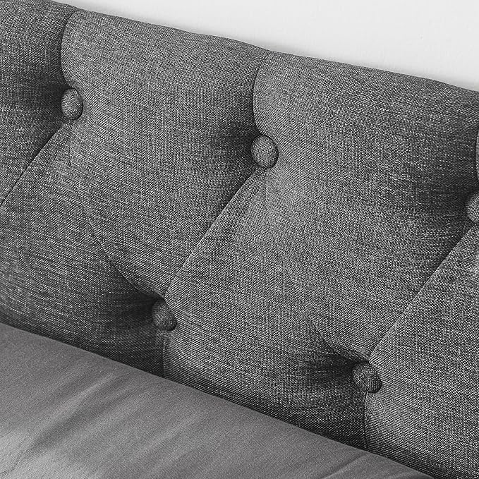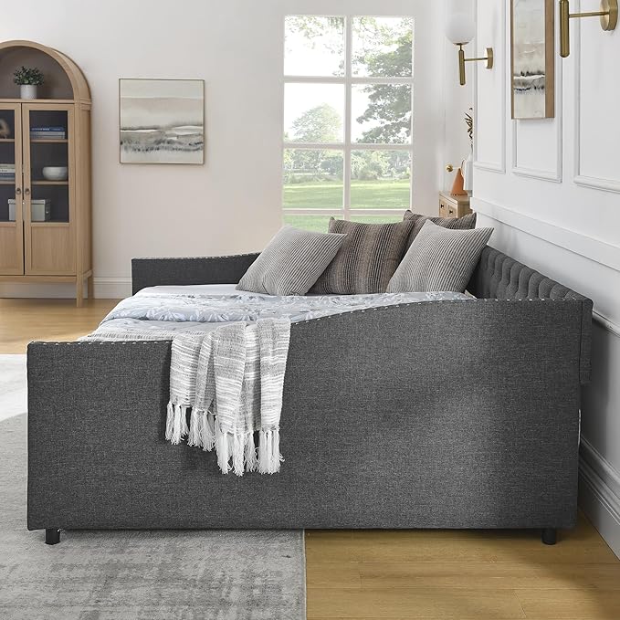 Queen Size Mid-Century Daybed, 2 Storage Drawers,Linen Button Upholstered Tufted Bed, Copper Nail on Waved Shape Arms, No Box Spring Needed,for Bedroom, Livingroom