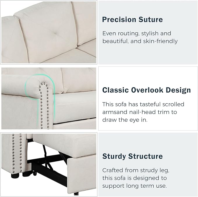 • Effortless style and easy care: Our sleeper sofa isn't just about functionality; it's also designed with style in mind. Traditional rolled arms and elegant nailhead accents add a touch of classic charm to any décor. And durable, easy-to-clean polyester upholstery makes it a practical choice for busy households, ensuring your sofa stays beautiful and easy to care for.
