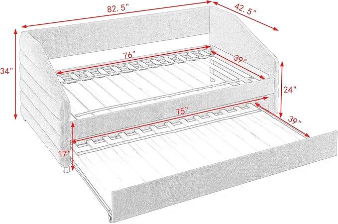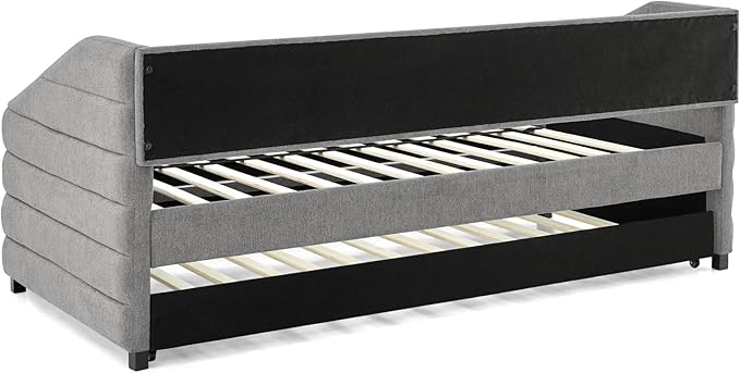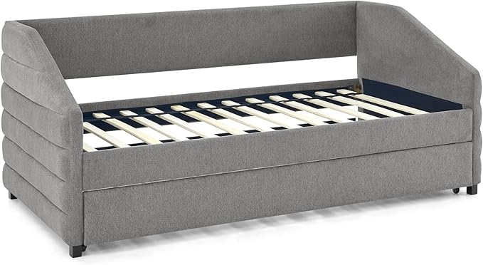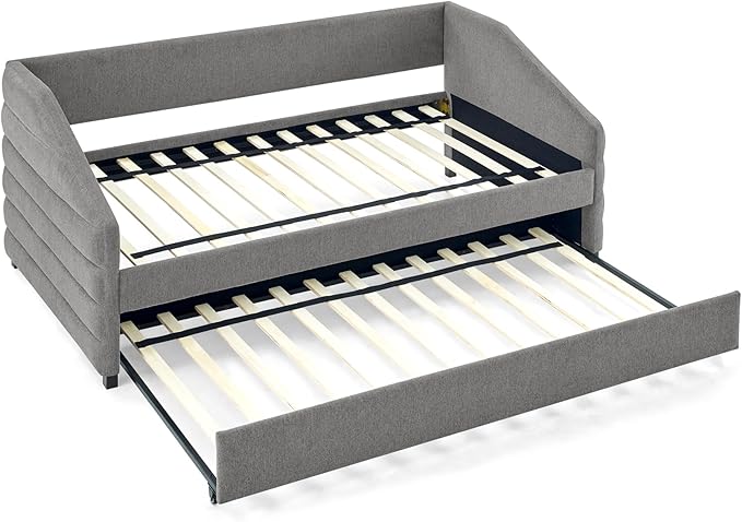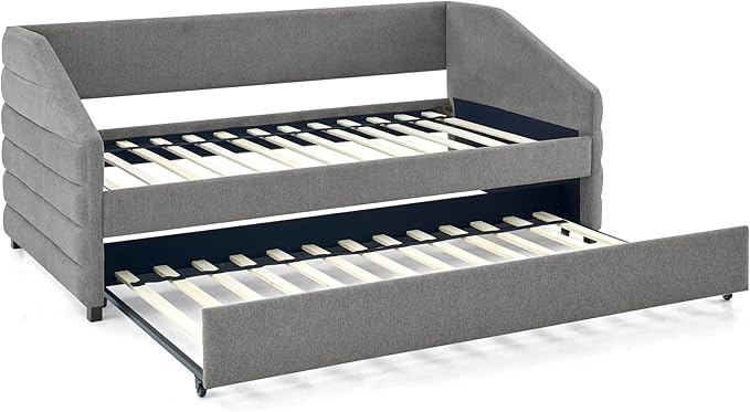 Linen Upholstered Twin Size Daybed with Trundle, Solid Wooden Bedframe w/Pull Out Bed and Tufted Decorate, No Box Spring Needed, for Kids, Bedroom, Dorm