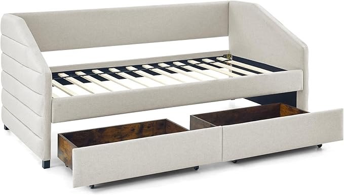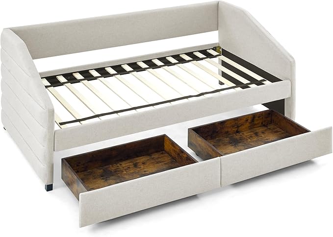 Linen Upholstered Twin Size Daybed with Two Storage Trundle Drawers, Solid Wooden Bed Frame w/Tufted Decorate, No Box Spring Needed, Space-Saving Design