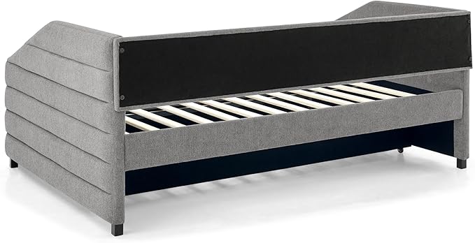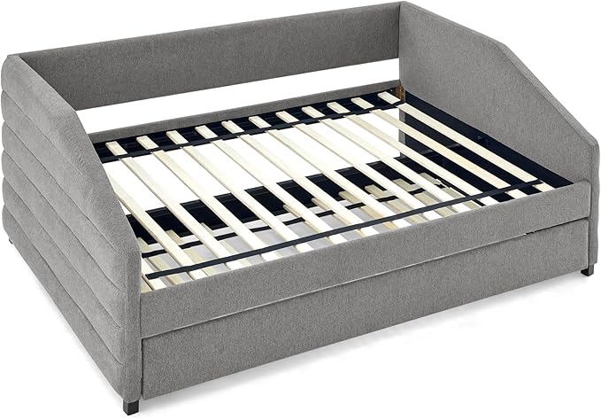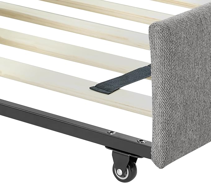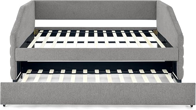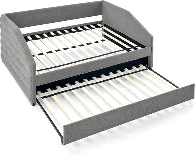 Linen Upholstered Full Size Daybed with Trundle, Solid Wooden Bedframe w/Pull Out Bed and Tufted Decorate, No Box Spring Needed, for Kids, Bedroom, Dorm