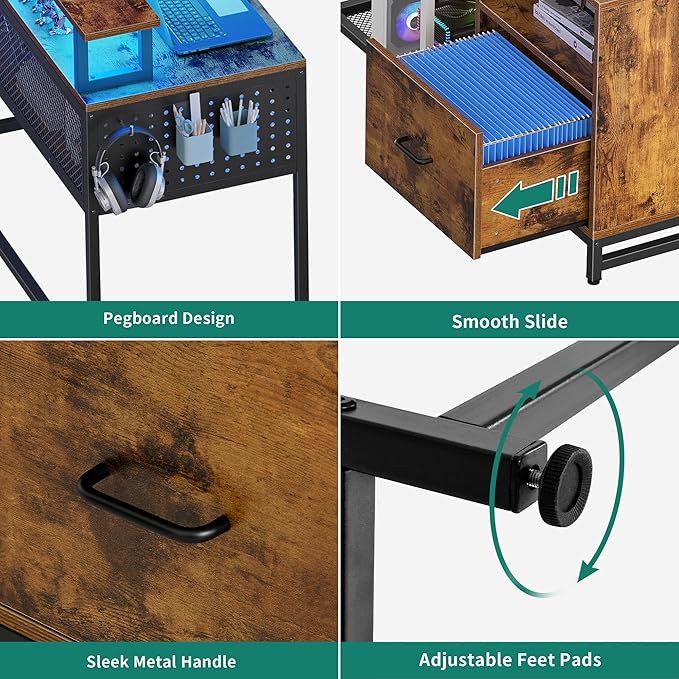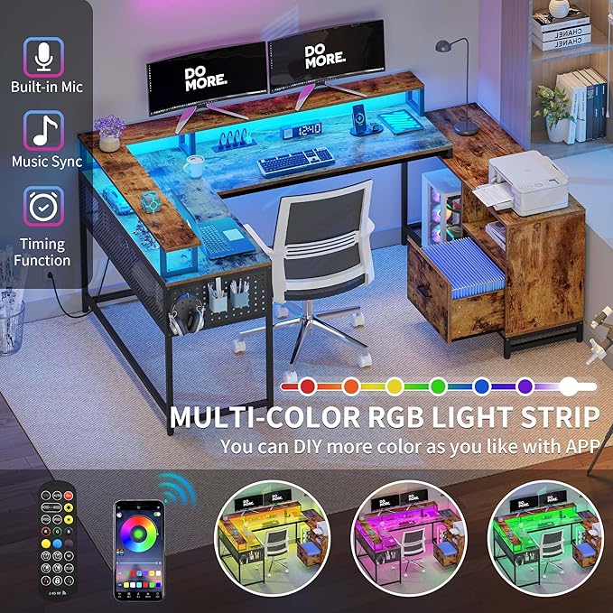 YITAHOME U Shaped Desk, L Shaped Desk with Drawers, Reversible Computer Desk with Power Outlets & LED Lights, Corner Desk Office Desk with Monitor Stand & Storage Shelves, Rustic Brown