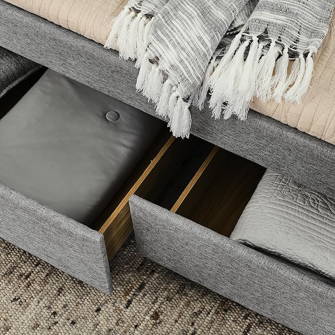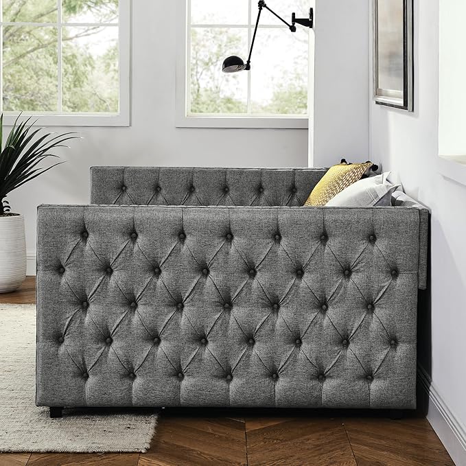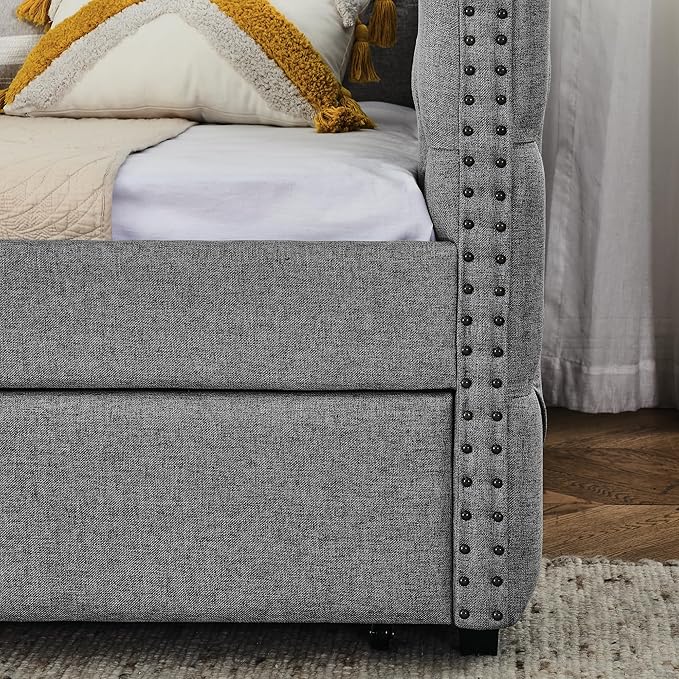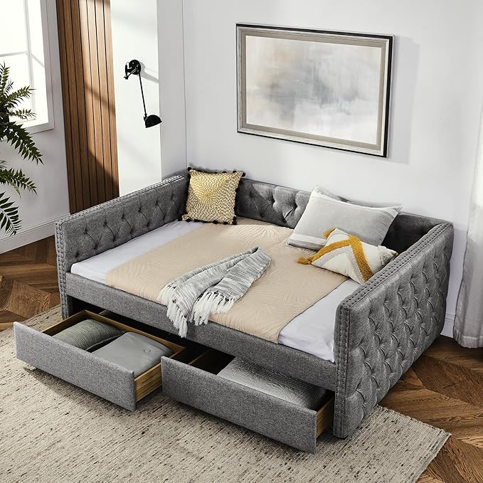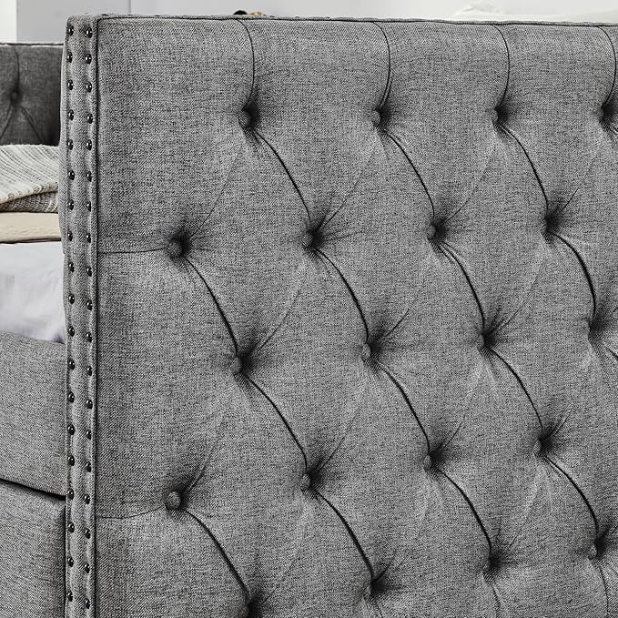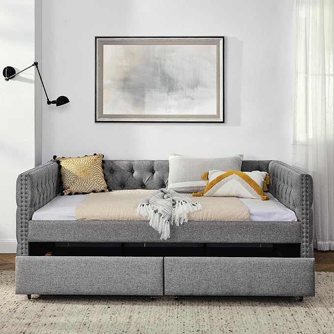 Full Size Upholstered Daybed, Pull Out with Two Storage Drawers, Solid Wood Frame Bed, Tufted Buttons and Copper Nails On Square Arms, for Bedrooms,Apartments