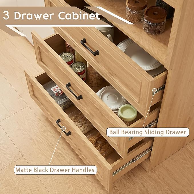 72" Tall Bookshlef with 3 Drawers, Farmhouse 4-Tier Bookcase with Adjustable Shlef, Wooden Storage Cabinet for Living Room, Kitchen, Home Office, Dining Room, Natural