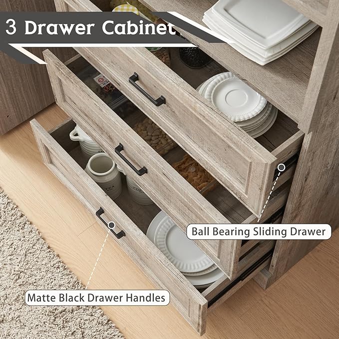 72" Tall Bookshlef with 3 Drawers, Farmhouse 4-Tier Bookcase with Adjustable Shlef, Wooden Storage Cabinet for Living Room, Kitchen, Home Office, Dining Room, Grey
