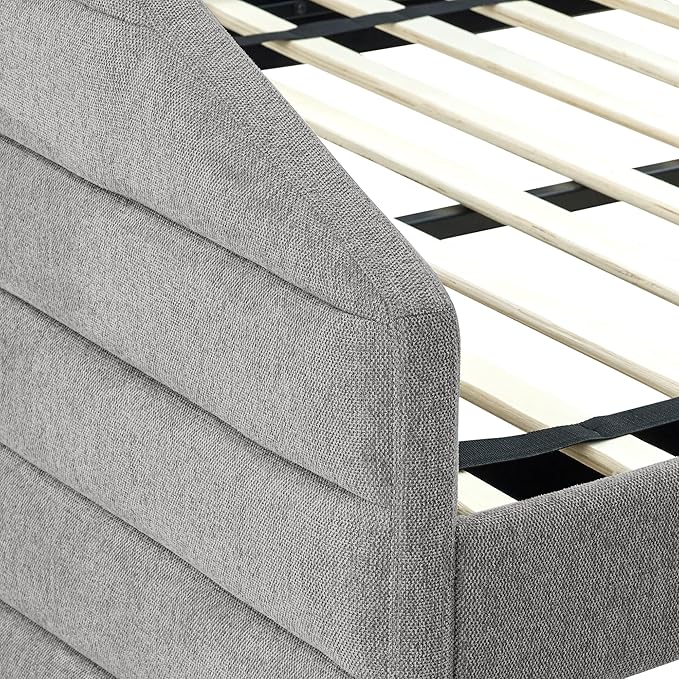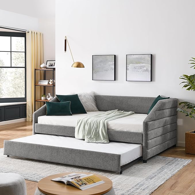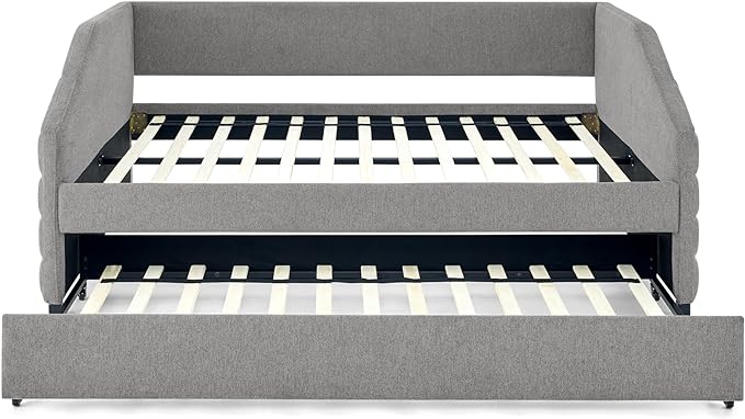 Linen Upholstered Full Size Daybed with Trundle, Solid Wood Tufted Sofa Bed Frame w/Pull Out Bed for Guest Room, Bedroom, Dorm, No Box Spring Needed, Grey