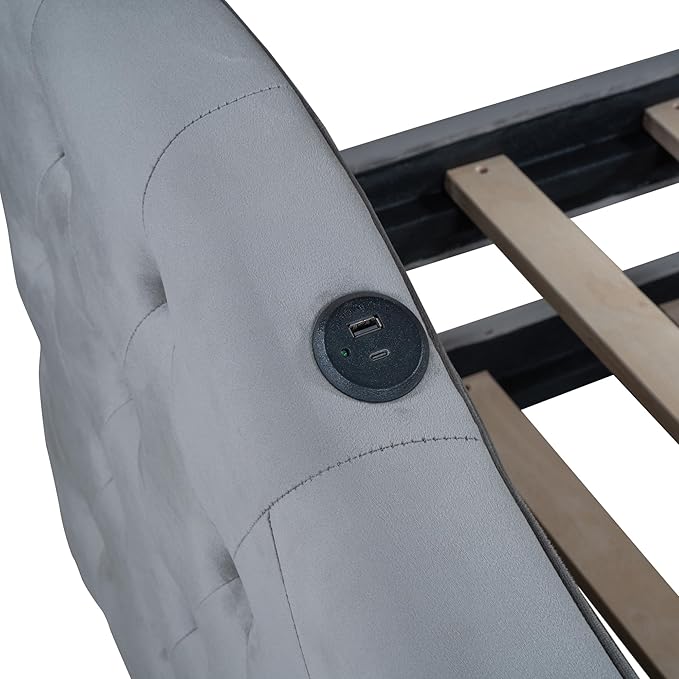 Twin Size Velvet Tufted Upholstered Daybed with Trundle, Modern Solid Wood Sofa Bed w/USB & Type-C Charging Ports, for Bedroom Living Room, No Box-spring Needed, Gray