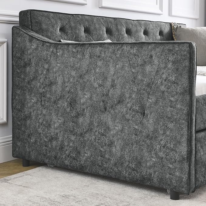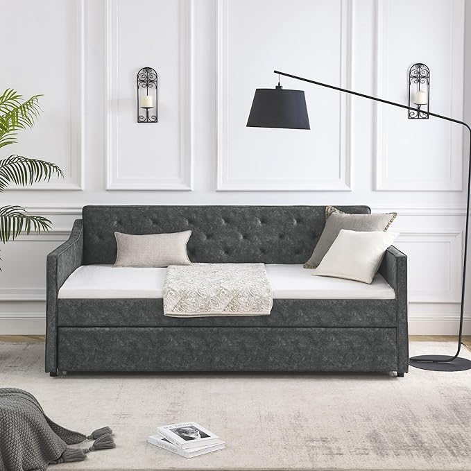 Upholstered Twin Size Daybed with Twin Trundle, Solid Wood Sofa Bed w/Button Tufted Backrest and Waved Shape Arms, for Kids, Living Room, Bedroom, Dorm, No Box Spring Needed, Grey