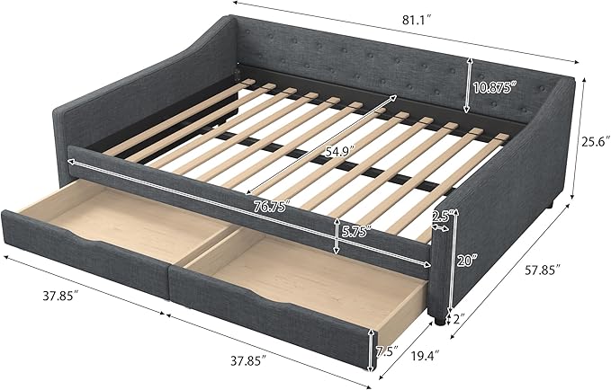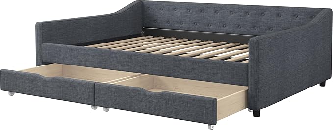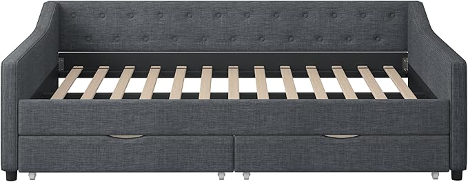 Full Size Daybed with 2 Drawers, Upholstered Tufted Sofa Bed with Button on Back and Piping on Waved Shape Arms for Bedroom, Apartment, Living Room, Wooden Slats Support, Dark Grey
