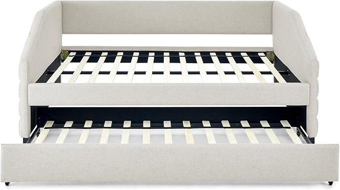 Linen Upholstered Full Size Daybed with Trundle, Solid Wood Tufted Sofa Bed Frame w/Pull Out Bed for Guest Room, Bedroom, Dorm, No Box Spring Needed, Beige