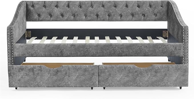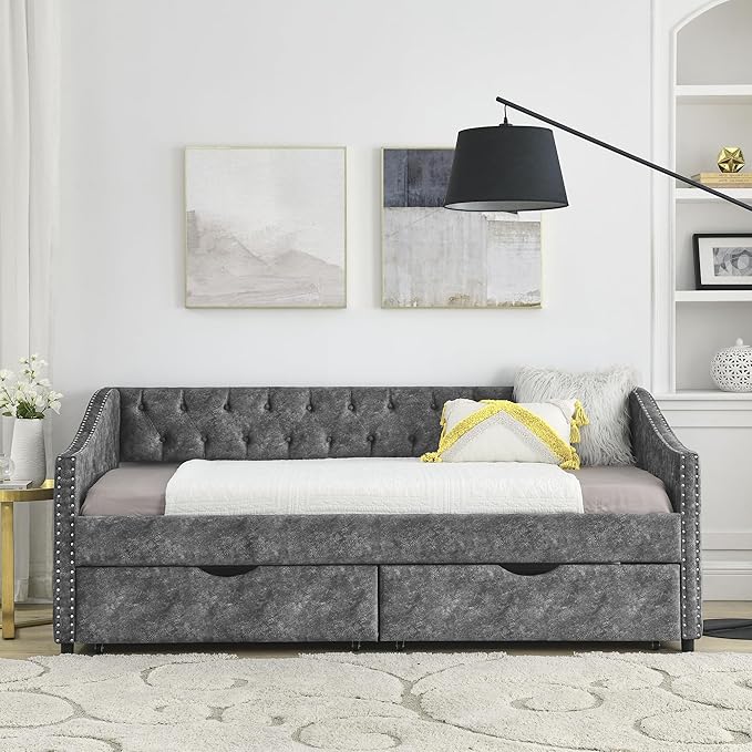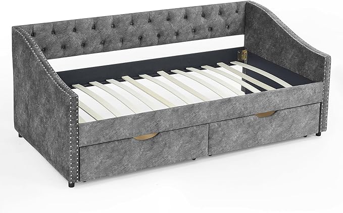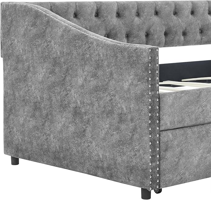 Twin Size Upholstered Daybed with Two Storage Trundle Drawers, Wooden Sofa Bed w/Button Tufted Backrest and Waved Shape Arms, No Box Spring Needed, for Living Room, Bedroom, Dorm, Grey