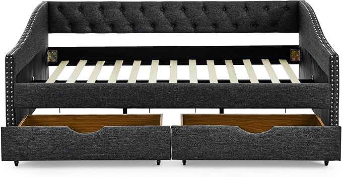 Full Size Daybed with Two Storage Drawers, Linen Upholstered Tufted Sofa Bed w/Button on Back and Copper Nail on Waved Shape Arms, for Bedroom Living Room, No Box Spring Needed, Dark Grey