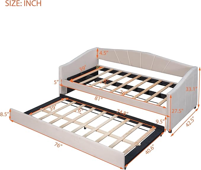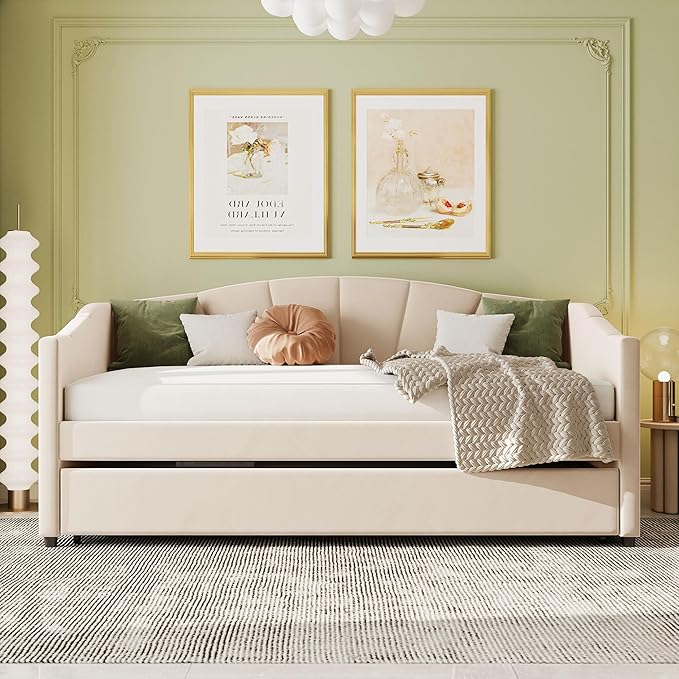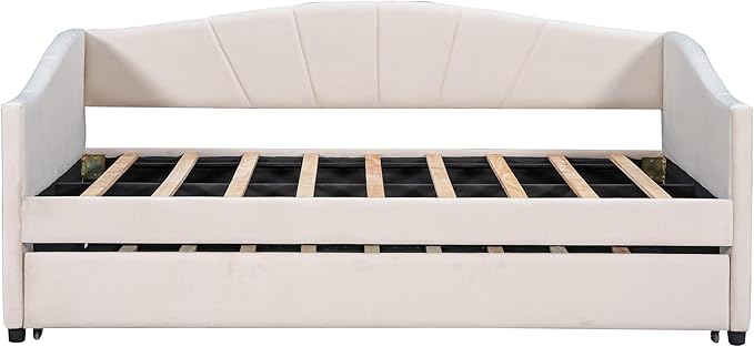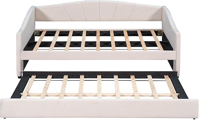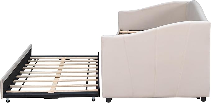 Twin Size Upholstered Daybed with Trundle, Wood Slat Support Sofa Bed with Armrest, No Box Spring Needed, Easy to Assemble, for Studio, Bedroom, Living, Guest Room, Beige