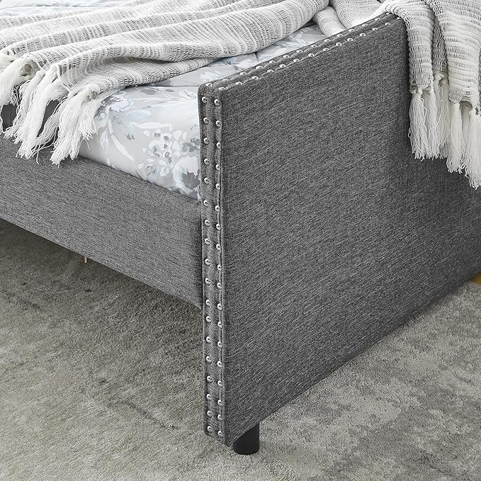 Queen Size Daybed with Two Storage Drawers, Linen Upholstered Tufted Sofa Bed w/Button on Back and Copper Nail on Waved Shape Arms, for Bedroom Living Room, No Box Spring Needed, Dark Grey