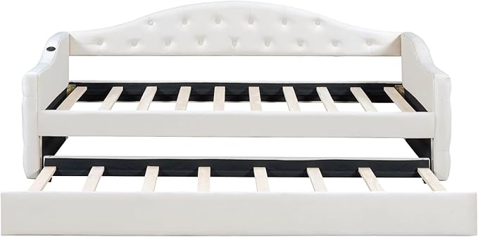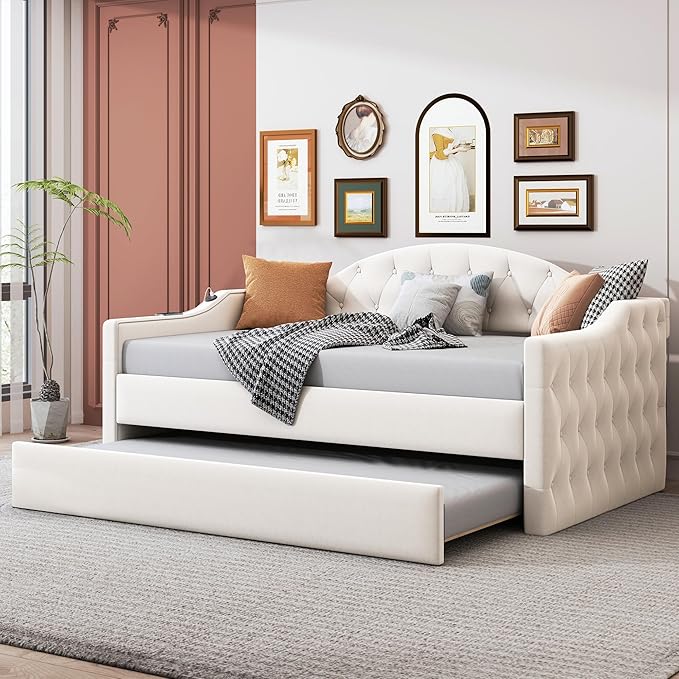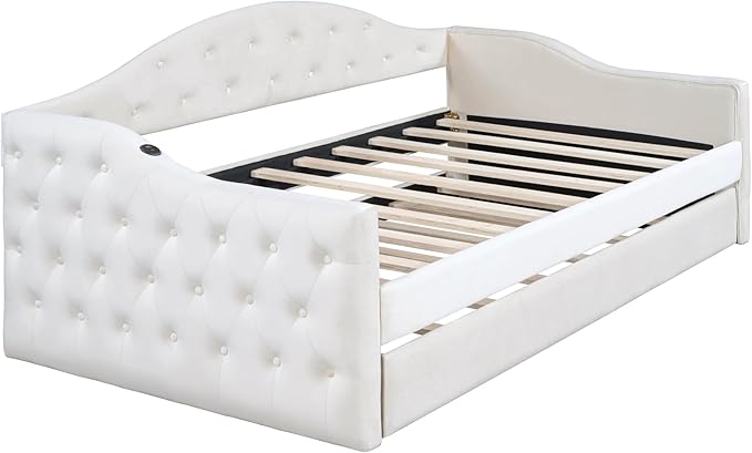 Twin Size Velvet Tufted Upholstered Daybed with Trundle, Modern Solid Wood Sofa Bed w/USB & Type-C Charging Ports, for Bedroom Living Room, No Box-spring Needed, Beige